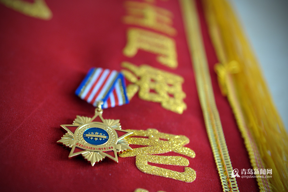 老人家中悬挂着社会上的志愿者组织为他做的锦旗和勋章。(孙志文 摄)