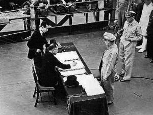 1945年9月2日,日本投降代表团由外相重光葵在“密苏里”号甲板上签署投降文书。