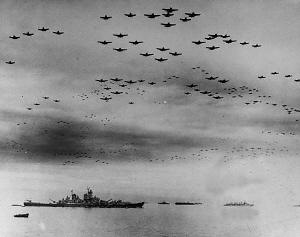 美军近千架飞机编队飞过密苏里号上空,见证这一伟大历史时刻,宣告日本法西斯的彻底失败。