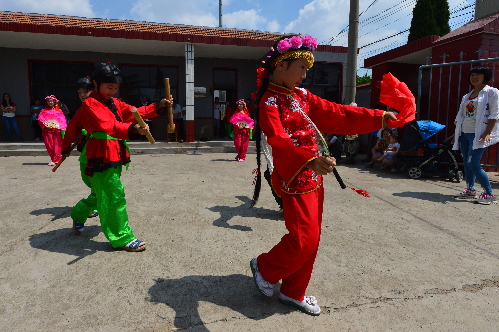 在斜沟崖村,孩子们在表演之前都要换上十分鲜艳的传统服饰。孩子们戴上奇怪的帽子和头饰,鼻子下夹个八字须,互相看了都会调侃嬉闹一番;表演时,孩子们都非常投入,村民观看得津津有味。这些活跃的场面让人意识到,胶州秧歌不是硬生生的文化遗产,而是一种深植于人们心中的民间文化,具有强大的生命力。传承人组织孩子来传承胶州秧歌,这个决定明智而有远见,因为这符合活态传承的要求,让薪火相传成为可能。
