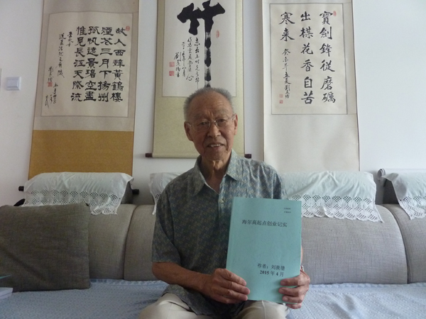 刘羡塘向记者展示他的心血之作《海尔高起点创业纪实》。