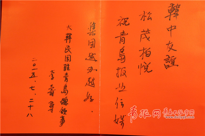 记者一见面,李寿尊就以一口流利的汉语,欣然说起他对青岛的美好印象。“青岛是一座美丽的海滨城市,被韩国人广为熟知。当我得知被确定来青岛就任总领事的消息后,特别高兴。12年前,我曾与家人一起到青岛度假,我喜欢这里的清新空气、碧海蓝天、滨海美景,喜欢崂山、海水浴场和青岛啤酒。我还曾经与妻子沿着海边一直步行了三个多小时,一路上看美景……”