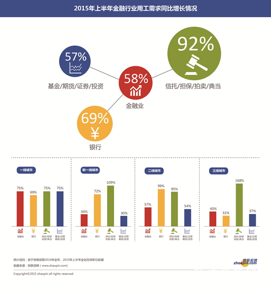 而从2015年上半年智联招聘各行业全站在线需求同比数据来看,基金/证券/期货/投资行业就业景气程度的高企,与就业需求的增速迅猛不无关系。今年上半年,整体金融行业的用工需求同比增长了58%。回顾上半年的市场行情,上证指数从3100点狂飙到了5000点以上,虽然在6月出现了一定回调,但是整个社会对股市及金融的关注程度因为本轮牛市再次被点燃。在一定程度上推动了券商、基金、私募、信托等机构用工量的喜人增长。其中,基金/证券/期货/投资等与股市关联度较大的金融细分行业在今年上半年的用工需求都有所增加。其中,在一线城市该数字增长了75%。