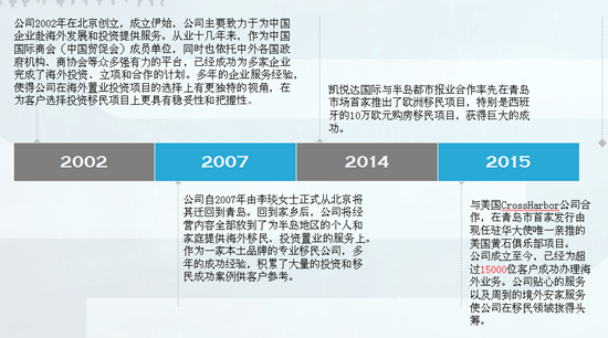 公司由创始人李琰女士于2002年创立于北京,成立伊始,公司主要致力于为中国企业赴海外发展和投资提供服务。从业十几年来,作为中国国际商会(中国贸促会)成员单位,同时也依托中外各国政府机构、商协会等众多强有力的平台,已经成功为多家企业完成了海外投资、立项和合作的计划。多年的企业服务经验,使得公司在海外置业投资项目的选择上有更独特的视角,在为客户选择投资移民项目上更具有稳妥性和把握性。