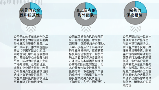 公司凭借多年积累的外事经验,专业的智囊团队、权威的律师团队和自有的境外办事处等,保证了为客户提供从咨询开始到国外安家、子女教育、海外医疗等一系列的一条龙专业贴心服务。