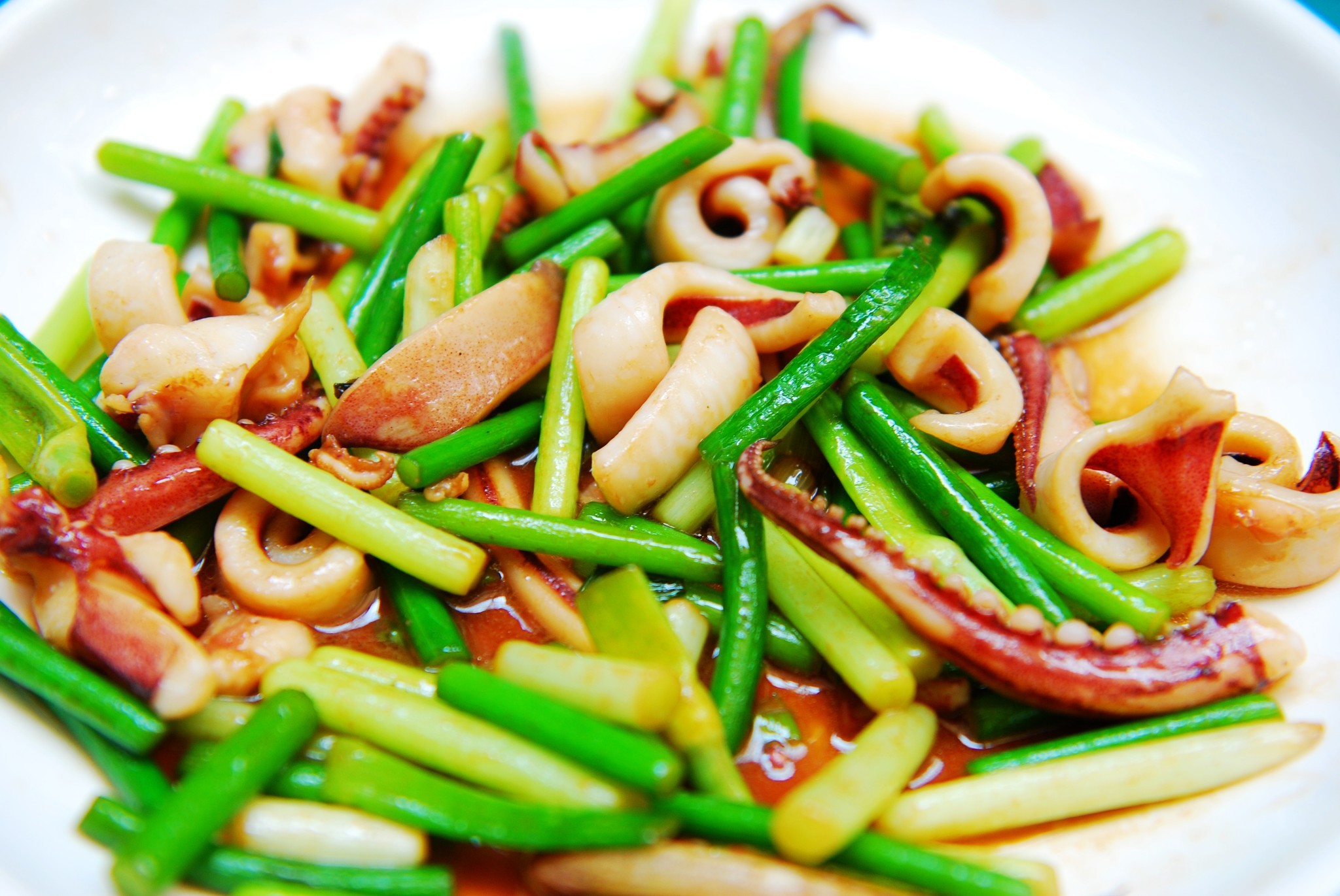 食材:蒜薹、鱿鱼、色拉油、盐、料酒、甜面酱、红椒、胡椒粉