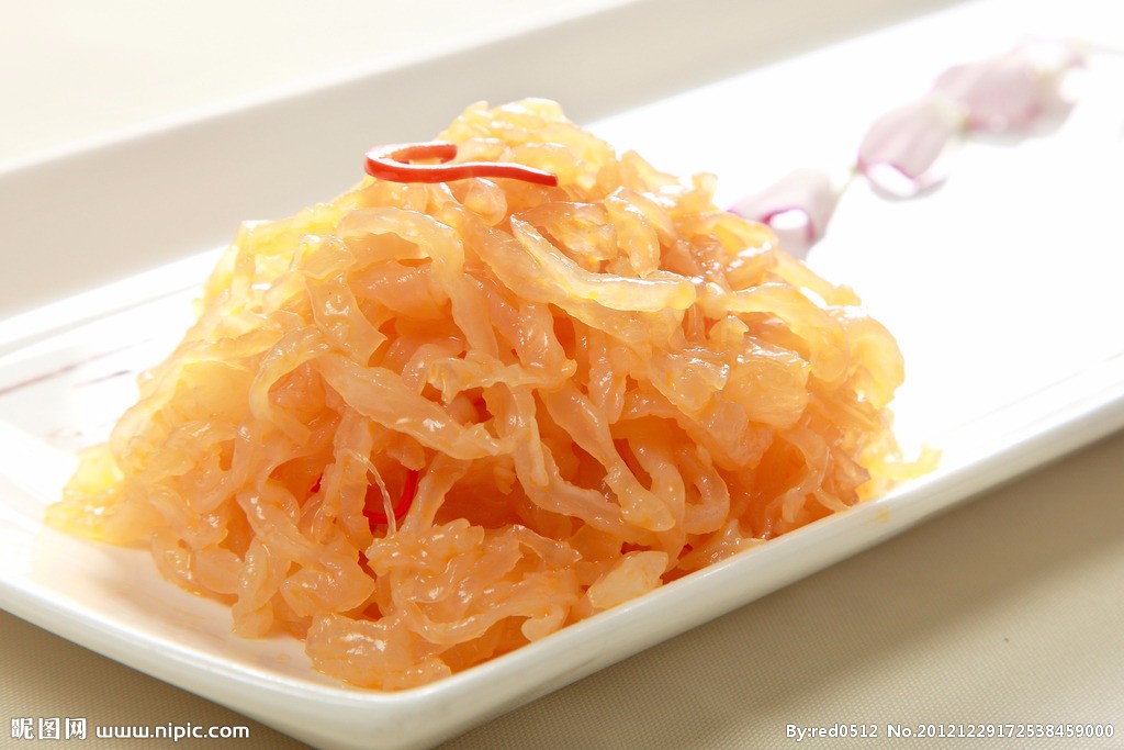 ②观肉质,质量好的海蜇,皮薄、张大、色白而且质坚韧不脆裂;