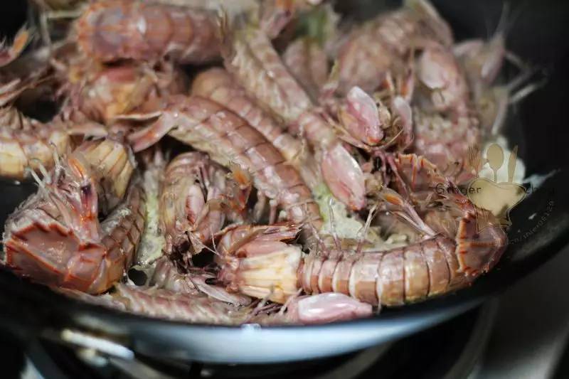 ⑤待虾的一面变红后放入葱姜丝,然后翻面;