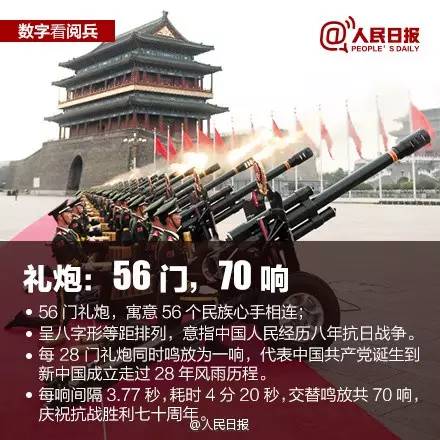 阅兵当天共有56门礼炮,寓意56个民族心手相连;呈八字形等距排列,意指中国人民经历八年抗日战争。
