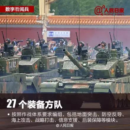 27个装备方队,由清一色国产新型装备组成,涵盖地面突击、防空反导、战略打击、信息支援、后装保障、海上攻击6个作战模块,将展现解放军未来打赢信息化条件下局部战争的作战力量。