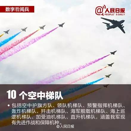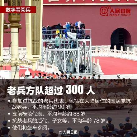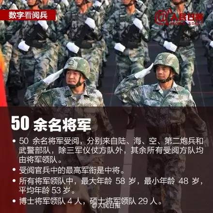 受阅方队一共50个,其中2个抗战老同志方队、10个空中梯队、11个徒步方队、27个装备方队。
