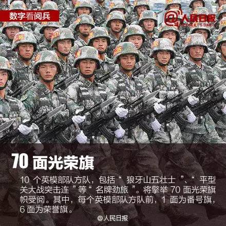 10个英模方队每个方队有7面旗,共70面旗,象征抗战胜利70周年。56门礼炮代表了56个民族,70响鸣放代表着胜利70周年,200名国旗护卫队员代表党中央提出的“两个一百年”。