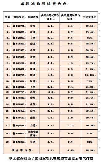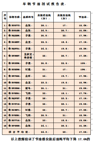 同样是这些车辆,同时进行了ST-6.0柴油节能减排节油测试。测试数据验证了这些车辆安装ST-6.0柴油节油器后,油耗平均下降 17.6%的功效。