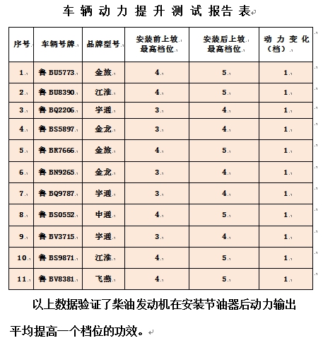 以下是节油性能、降低尾气性能、动力提升效果、降噪效果等方面的测试报告表。