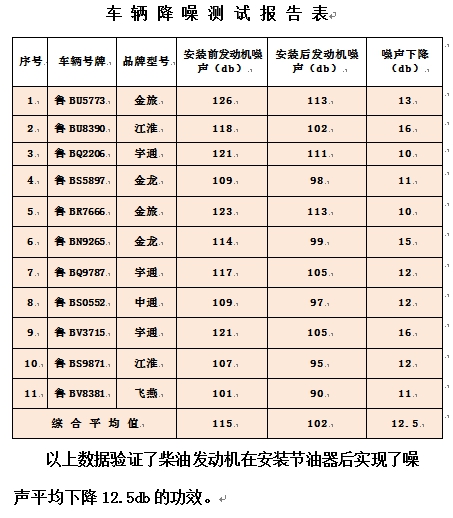 如此同时,将这些车辆安装ST-6.0柴油节油器,正常运行二十分钟后停放在测试地点,将转速空置在1000转/分钟,在发动机一米处用噪声检测仪采集噪音指数,噪声平均下降12.5db。
