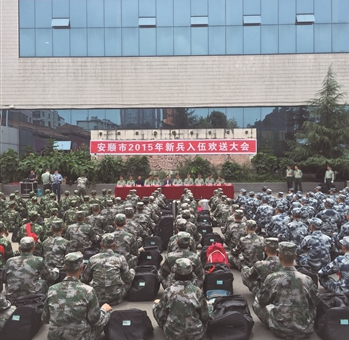 9月15日,安顺火车站广场军歌嘹亮,锣鼓声声,2015新兵欢送会在此举行,新兵们满怀献身国防的豪情,整装待发。市委常委、副市长周志龙出席欢送会并讲话,市委常委、安顺军分区司令员姚俊懿,军分区政委陈罡出席欢送会。
