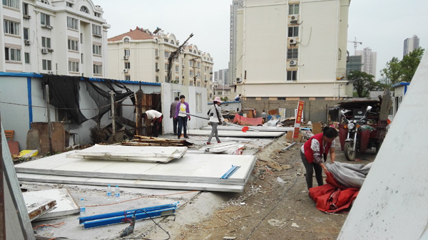 “以前搭建的板房上到处贴小广告,墙角还容易堆放垃圾,秩序也不太好,前几天执法人员把这些板房全部拆除了,现在居住环境可比以前好很多。”中韩社区居民刘先生高兴地说。据了解,中韩社区小区是开放性小区,由于长期缺乏有效管理,导致部分居民在楼栋周边的空地上私搭乱建,空地都抢占盖成了一处处低矮的苯板房,用来当车库、仓库、商铺,甚至用来住人,违法建筑面积达15000平方米。“长期以来,这些违法建筑不仅用水用电混乱,还给周边环境造成了一定的负面影响,另外,这些违法建筑所用材料大都是易燃材料,存在较大的安全隐患,而且有的建筑占用了消防通道,一旦发生火灾,消防车都无法顺利到达营救。”中韩新型社区服务中心主任陈慧介绍,为了彻底排除安全隐患,整治居住环境,中韩新型社区联合城管执法人员组织了200余人对此区域的违法建筑进行彻底拆除。