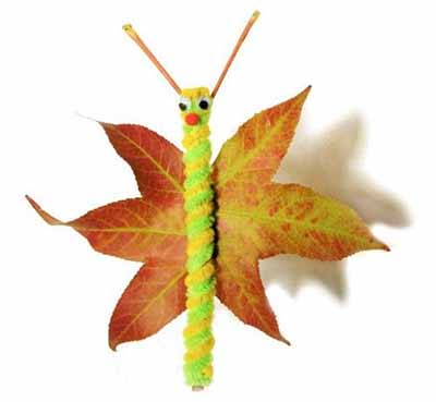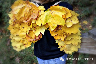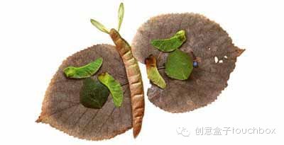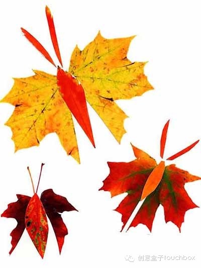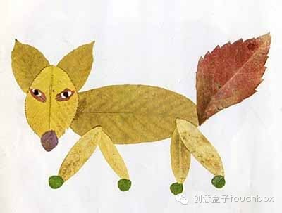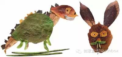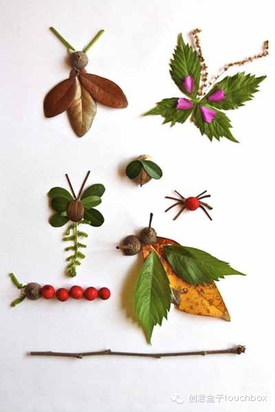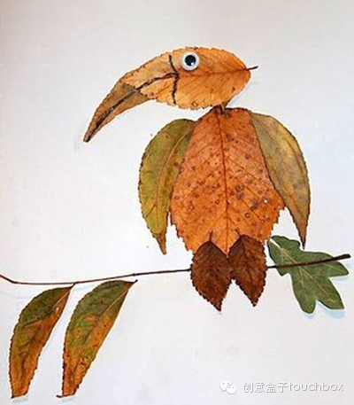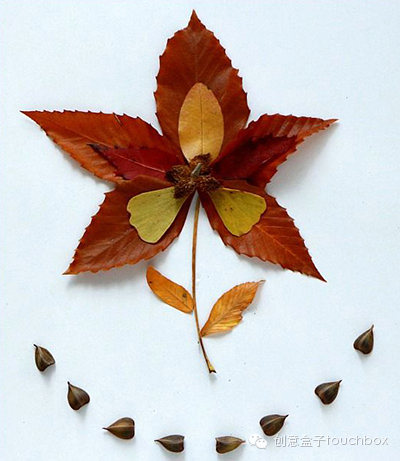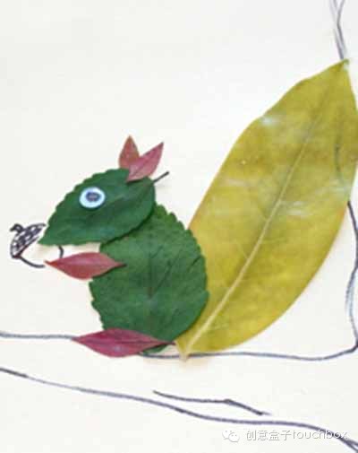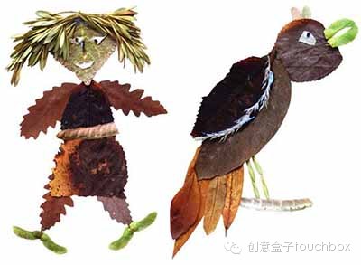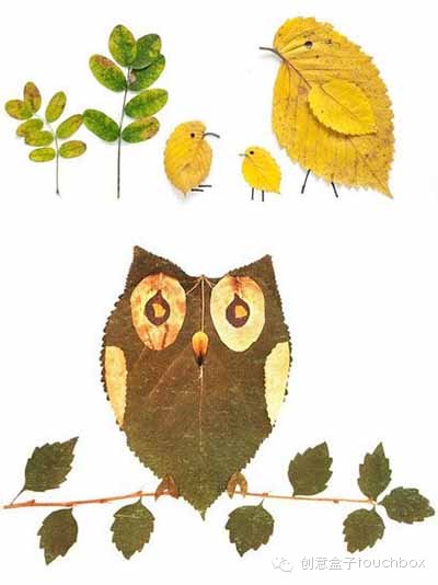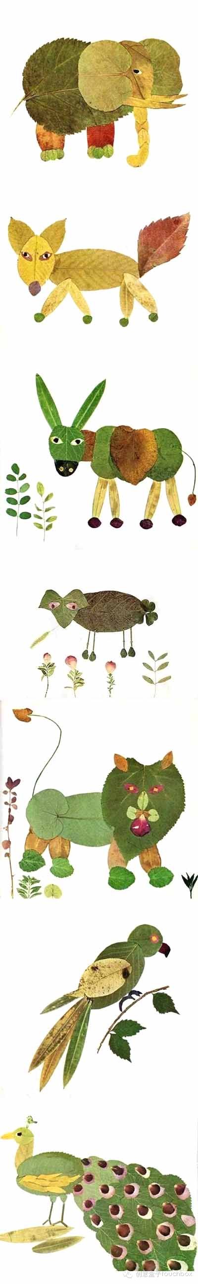 有趣的树叶拼贴画。使用各种形状,各种姿态,各种色彩的树叶进行拼贴,千变万化,造型多样。