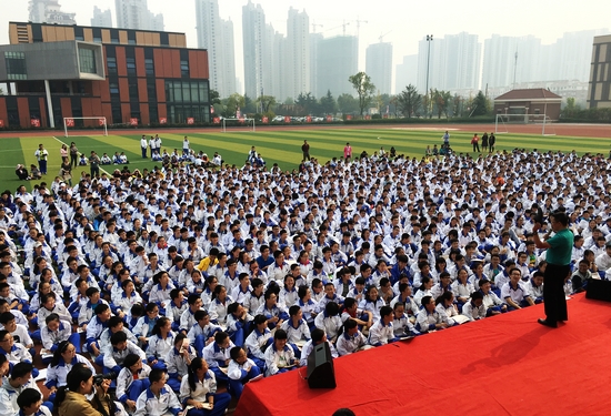 李阳带领疯狂英语团队来到青岛经济技术开发区实验初级中学现场演讲