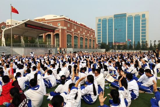 李阳带领疯狂英语团队来到青岛经济技术开发区实验初级中学