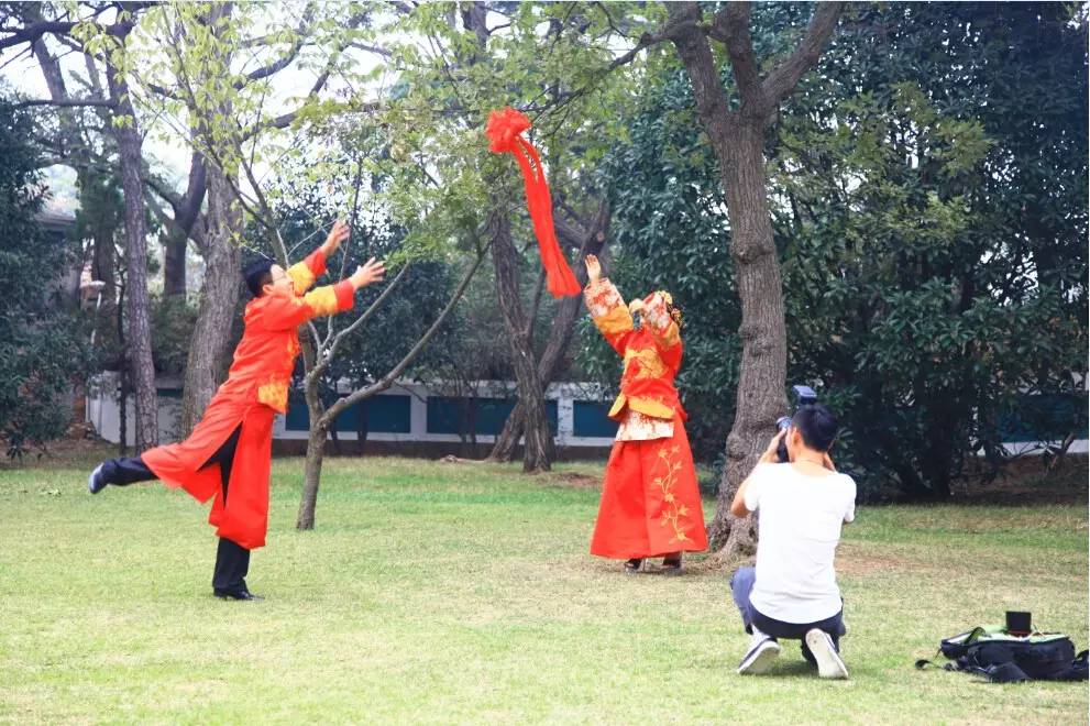 八大关里一对在拍婚纱照的新婚夫妻。
