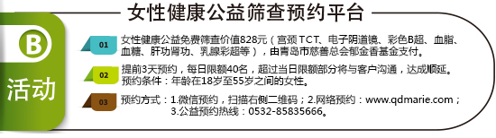 此外自2015年10月25日至2016年1月30日,18岁至55岁之间的女性可享受妇科常规检查、电子阴道镜、白带常规、尿常规、彩色B超、心电图、肝功能8项、肾功能3项、血糖、血脂2项、宫颈液基薄层细胞制片术TCT、乳腺红外线检查、乳腺彩超、乳腺触诊等检查(总价值828元)
