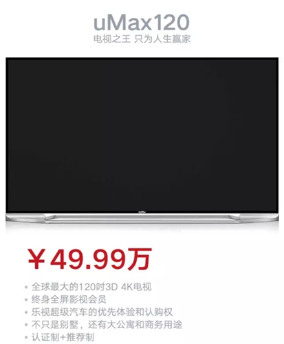 10月28日,uMax120在乐视商城()正式开启申请认证。目前全球市场110英寸以上电视价格不菲,都在120万元左右,而作为行业巅峰之作的uMax120定价49.99万元,极限奢侈只为人生赢家。乐视将为这些人生赢家打造专享生态服务:1、采用会员制+推荐制,每一台都由极限科技+手工打造,保障高端用户的专属权益;2、超级汽车的优先体验和认购权;3、终身全屏影视会员。