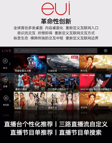 EUI5.5系统全球首创多类桌面,首次实现意识流交互,让用户所想即得,完全实现内容桌面化和去App化,影视、体育、游戏、购物、音乐等多样内容即是桌面,并可进行分众运营,让不同的人群有专属的内容桌面。