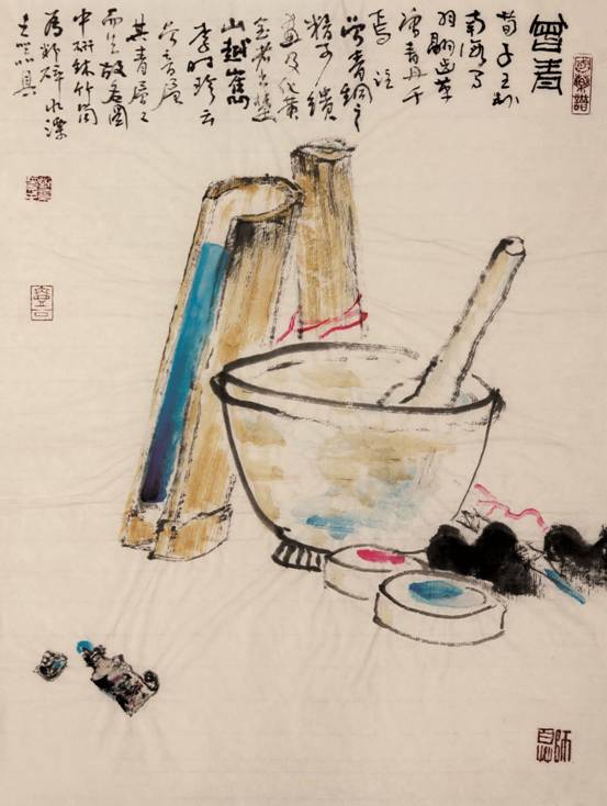 点评:曾青成分为碳酸铜。作者引李时珍话释名。引荀子玉制注入画。遂画研漂曾青为颜料之用具,以为款识巧妙呼应。曾青形色一目了然。
