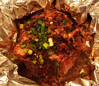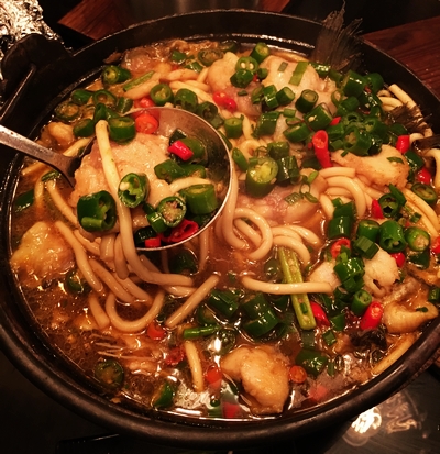 锅佰味四大锅之“丰都谭谭鱼”,重庆厨师界大咖谭先华先生原创的这个菜,是谭先生祖传的手艺,曾经在重庆一家餐厅使用过,大受好评,于是拿到了青岛。草鱼每斤29元,乌江鱼45元,江团鱼65元(直接挑这个吧,你懂得),标准锅都是2斤。这个菜的特点是鱼肉滑嫩,整片不散,不是油很厚的那种,可以算是尖椒系列新派重庆菜的典型。鱼肉隔夜就会发柴,所以当天的鱼只供应当天的食客,卖不掉会直接处理掉,不会留到第二天,保证品质。