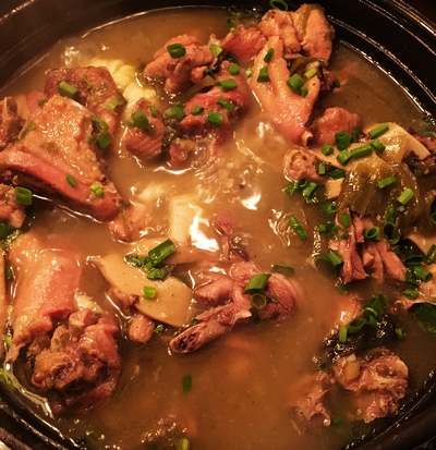 锅佰味四大锅之“酸菜么么鸡”,38元/斤,标准锅都是2斤。酸菜么么鸡,装盘很特色,容器是用铸铁打造的,下面铺着烧热的石头,以保持菜品的温度(灵感源自桑拿房)。原生态散养鸡来自五莲山,加上重庆直发到青岛的当地酸菜,力保重庆的原本江湖味道。