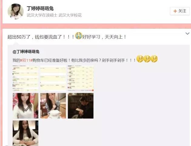 但不管你在今天买了多少,都没有这位武大女神丁婷婷买得多,她的淘宝购物车竟然有50万!