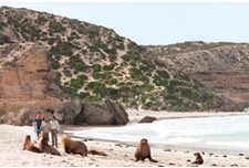 海豹湾以其庞大的稀有动物群——澳洲海狮群而著称,这是澳大利亚唯一一处游客可与海豹在沙滩上近距离接触的地方。自1803年开始,这里便有了生态记录,在20世纪前半叶,捕捞鲨鱼船曾任意捕杀海狮和海豹用作捕杀鲨鱼的诱饵,而因为海豹湾附近的海域水下有暗礁,海船无法靠近,这里的澳洲海狮才幸免于难。1954年,随着海豹湾水域保护区的成立,岛上的海狮群从此可以平安定居,繁衍后代。目前,这里共有海狮约600头,它们极通人性,对于游客们漫步在它们其中,表现得相当大度,当面对游客的镜头时,会摆好姿势,非常合作地为游客呈现一副生动的图画。