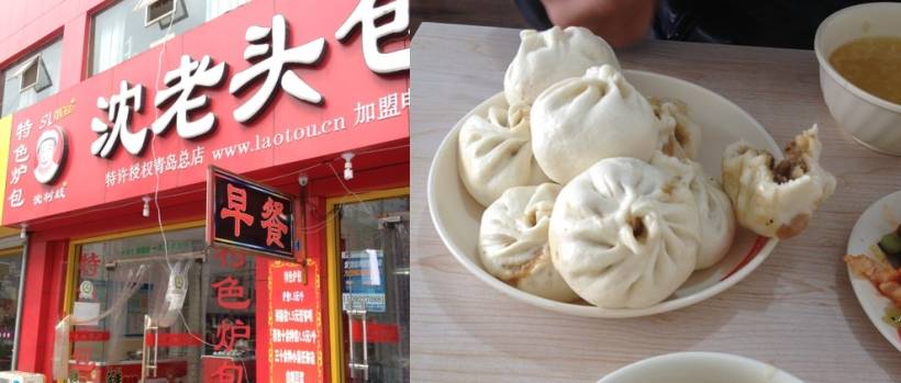 青岛老牌包子店了。墙上标语写着“土生土长的青岛人包的包子”。