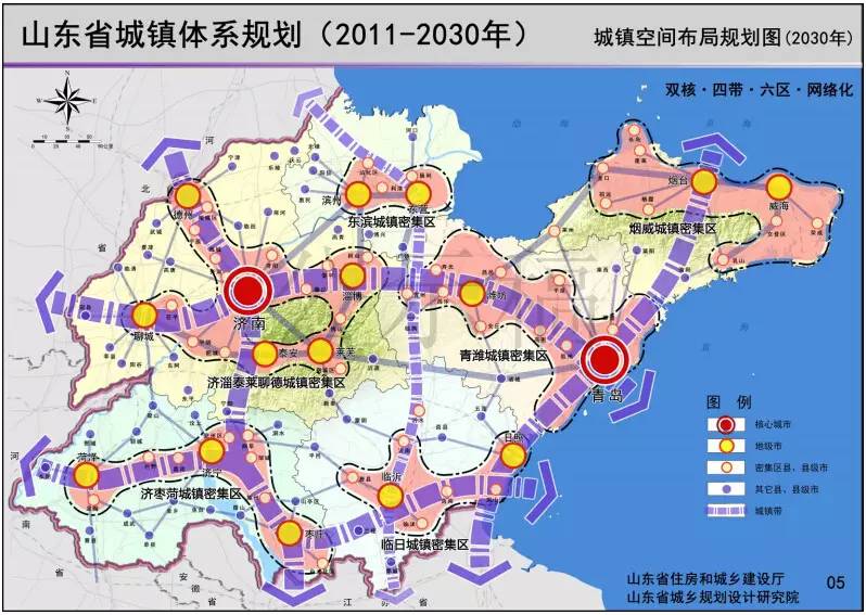 到2030年,全省将建立“双核、四带、六区”网络化城镇空间体系布局。其中,济南、青岛为两个核心城市,辐射带动全省城镇加快发展。壮大济青聊、沿海、京沪、鲁南四条城镇发展带,强化培育济南-淄博-泰安-莱芜-德州-聊城、青岛-潍坊、烟台-威海、济宁-枣庄-菏泽、东营-滨州、临沂-日照等六个城镇密集区。