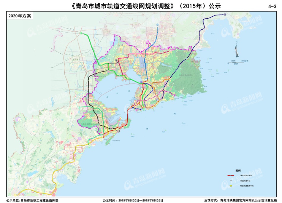 青岛市轨道交通2020年线网全长约470.4km,由11条轨道交通线路组成:主要包括1号线(41.6km)、2号线一期+东延(泰山路—世园会段,34.4km)、3号线(24.8km)、4号线一期(人民会堂—沙子口段,26.6km)、6号线一期(朝阳山—中韩园区段,33.1km)、7号线一期+北延(兴国路—北安段,27.9km)、8号线(60.9km)、9号线一期(红岛—惜福镇段,35.9km)、11号线一期(苗岭路—王村新城段,58.4km)、12号线(56.5km)、13号线(70.3km)。(青岛新闻网记者 于泓)
