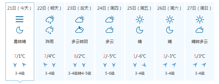 据市气象台预测,未来一周,岛城以多云到晴天气为主,22日~23日,全市大部地区有小雨,能见度逐渐转差,大部分地区有轻雾,局部有能见度小于1千米的雾。24日开始气温有所下降,市区最低气温降至-1℃。
