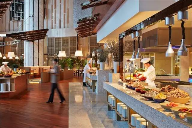 青岛香格里拉大酒店一品堂自助餐厅将海洋的感觉融入餐厅,花岗岩的食品台,未经雕琢的天花板,原木的餐台相融合带来了全新的独特的用餐体验。餐厅共有9个独立食档,通过极具欣赏性的布局使客人畅游其中,仿佛置身于“美食大剧院”。