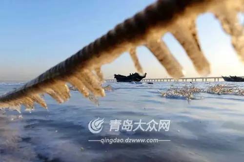1月22日上午9时许,大众网记者在青岛市黄岛区红石崖胶州湾大桥附近海域看到,海冰已经封住绵延数公里的滩涂,许多渔船被冻结在冰面中,缆绳上缀满着成排的冰溜子。