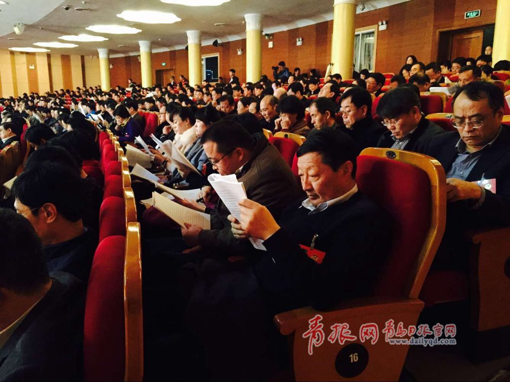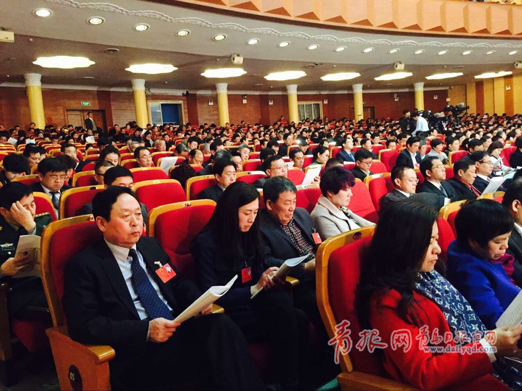 与会代表在大会现场听取张新起市长作市政府工作报告,认真翻阅会议材料。(青岛日报/青报网记者刘栋 摄)