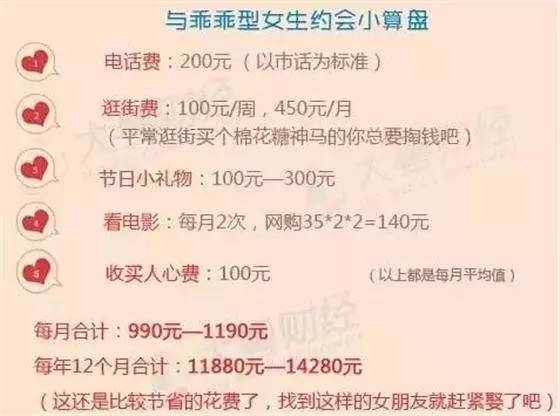 一份《2013~2014年度婚恋观调查报告》显示,全国男性在恋爱中的月平均花费为1591元。其中广东男性在恋爱中平均花费1614元,占工资的30%。恋爱成本1年1万5千元以上,但是,这也只是平均恋爱花费,不是所有女生跟男生谈恋爱都是一个“价”的,不同类型的女生谈恋爱的消费情况也不尽相同。