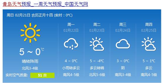 青岛今日晴转阵雨0℃至5℃ 周一小雨转多云