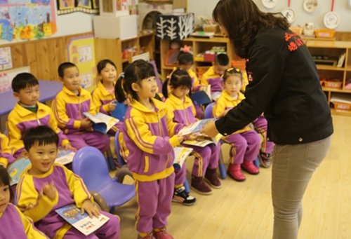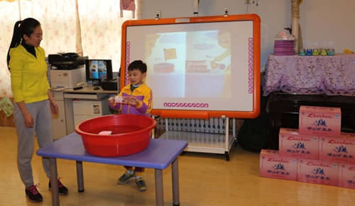 2月19日,在青岛市市南区南京路第三幼儿园,老师正在声情并茂的为小朋友们讲述关于《有趣的浮力游戏》中的内容,并且现场利用废旧的崂山矿泉水塑料瓶做了一个“小船”道具,为小朋友们演示浮力游戏的互动实验。