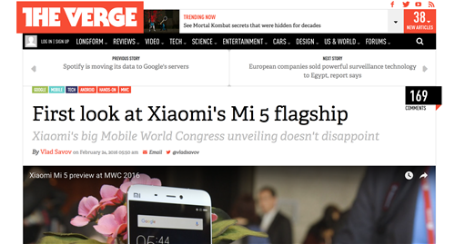 小米5的亮相得到了国际上知名媒体The verge的肯定,The Verge刊文称,作为中国智能手机市场上领军者之一,小米公司在全球最大手机展览会上同步首次发布其下一代旗舰智能手机——小米5。今天,小米公司初登世界移动通信大会舞台,详细展示最新顶级安卓智能手机,以向全球观众证实其自身实力。