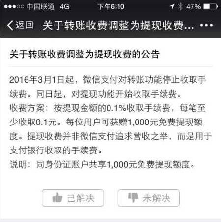 根据微信发布的公告,微信提现收费马上就要实施了,3月1日起,每笔收取金额0.1%的手续费。