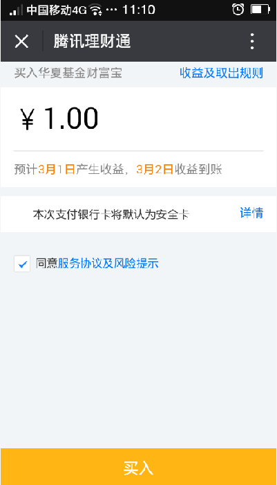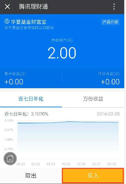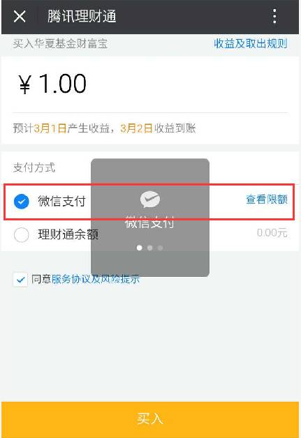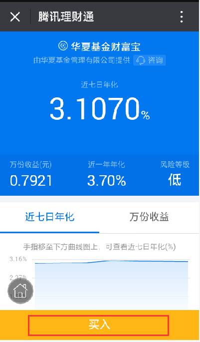 2、其次,你得有零钱,点击理财通按钮,第一次进入的时候,可以随便选择一个基金点进入。再点击买入。