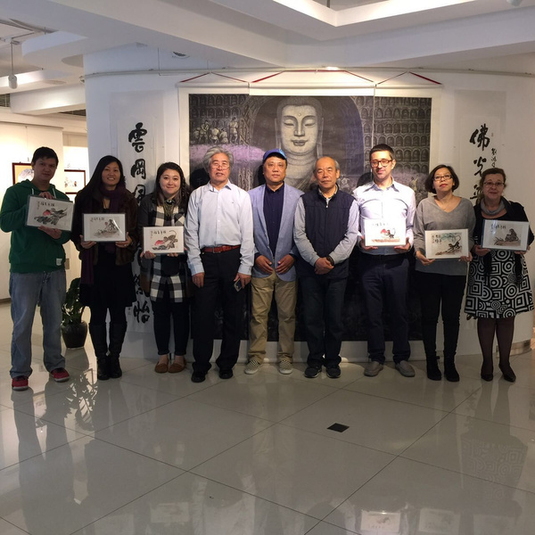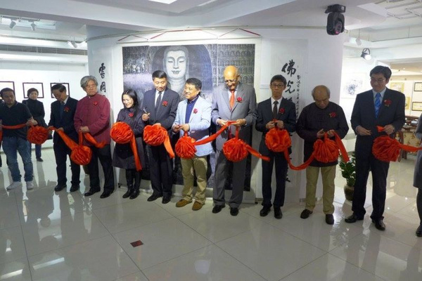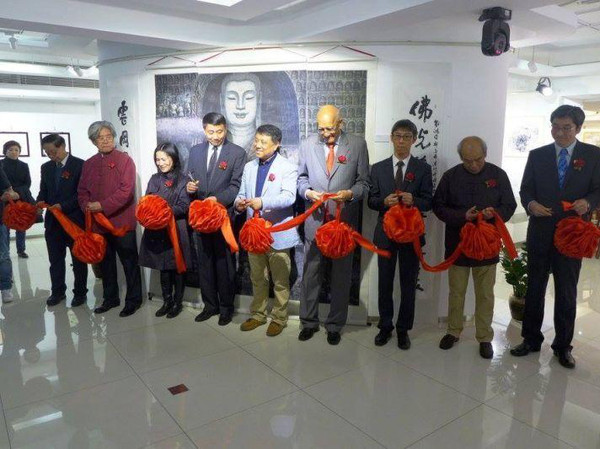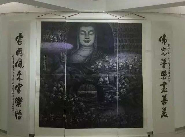 澳门著名古筝表演艺术家袁泉女士,携多位弟子到现场演出支持!展览现场,刘鸿信先生把官乐怡基金会的办会精神理念"无私奉献,精益求精"书写多幅赠送书画爱好者。郝志国先生为本次参展的巨幅云冈大佛画撰写对联,悬挂大佛画两侧,"佛光普照尽善美,雲冈风来官乐怡",为展览添彩,促进大陆与澳门地区文化交流.