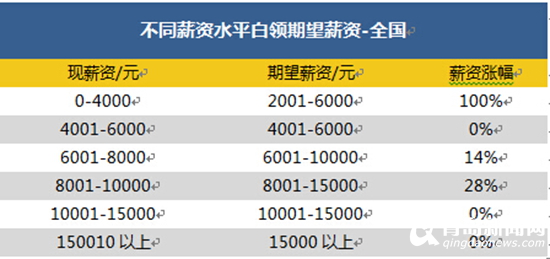 智联招聘调查数据显示,涨薪预期最高为现薪资0元-4000元,涨幅为100%。随后的6001元-10000元也有28%的大幅度涨幅。智联招聘认为,随着工作经验增加,尤其是当跳槽后实现岗位晋升的话,公司涨幅会比较大。当然,找工作不能光看起薪,还要看企业的发展前景和自我的发展空间等。