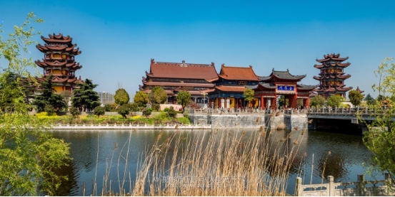 进入寺院要两次跨越汝河故道。因此,南海禅寺有个特点就是“桥多门多”。该建筑群以一桥一门为单元,三个单元风格各异,各具象征意义。第一单元就是这座和平门与和平桥,寓意世界和平、人类安康。南海禅寺处于汝河故道南段,汝河在这里反转了一个大S弯,从空中俯瞰就像一幅天然的太极图,寺院正坐落在太极图的阴阳极点上。第二单元,以合作桥与合作门为一组,寓意海峡两岸携手合作,人民安居乐业。