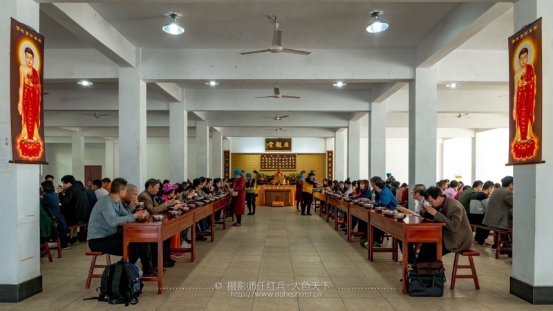 媒体朋友们从西山门进入南海禅寺,非常有幸在五观堂里享用了独具特色的斋饭。斋堂里,桌椅整齐,饭菜简单,大家有序就坐,每人面前摆放两碗及筷子,一碗盛汤一碗盛饭莱。吃饭有礼数,有专人加饭,不能随便离座去加饭,不得高声说话,更不可嬉笑吵闹,出家人惜米如金,所以浪费粮食是大不敬。